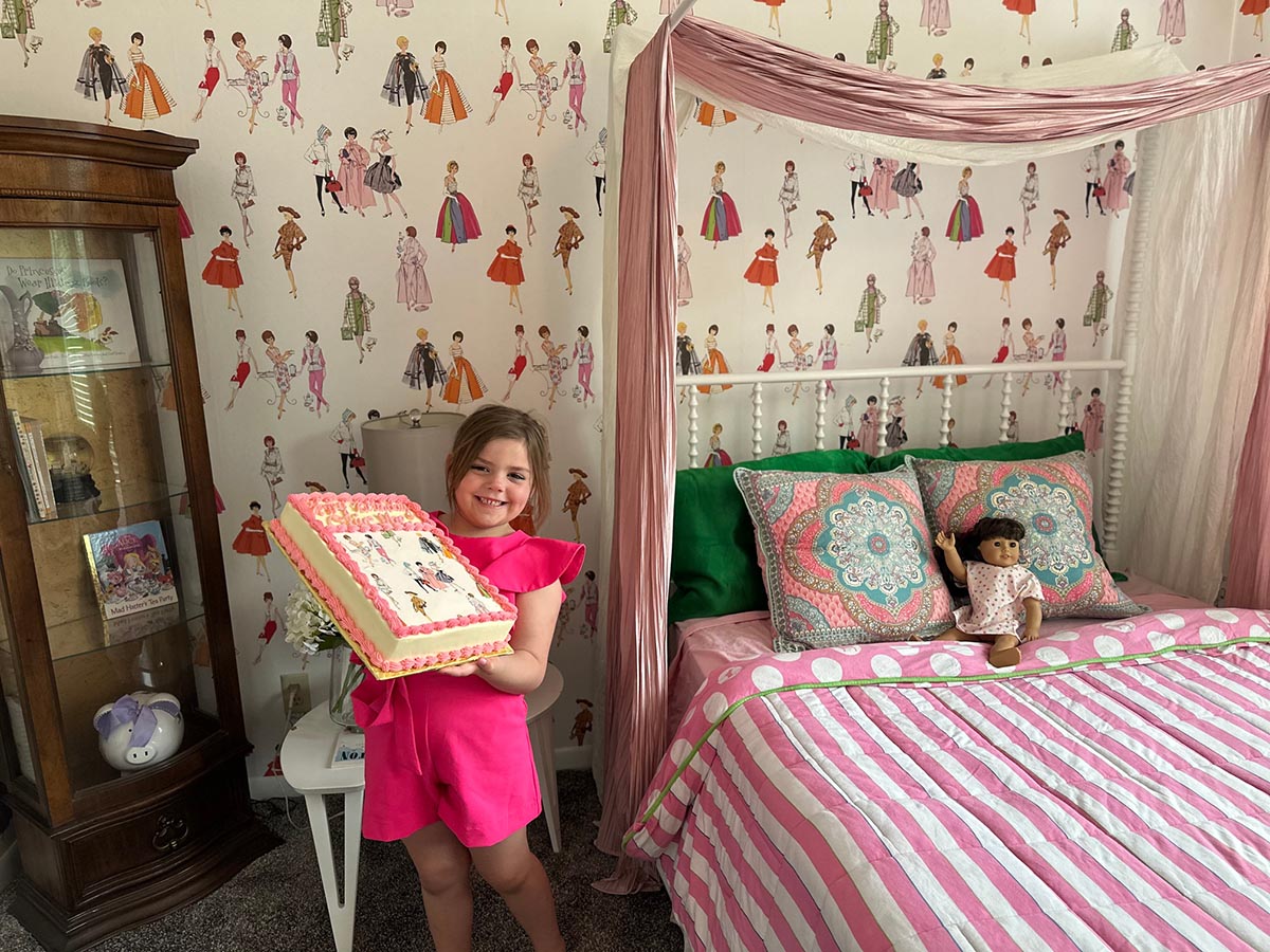 This vibrant room remodel takes the cake in Denison, TX, features vintage Barbie wallpaper by Wallshoppe, transforming the space into a playful and glamorous retreat reminiscent of a Barbie Dreamhouse. The bold design choice, bursting with iconic pink hues and retro charm, creates a unique and unforgettable space that sparks joy and inspires creativity. It’s so cute we made a matching cake to celebrate!
